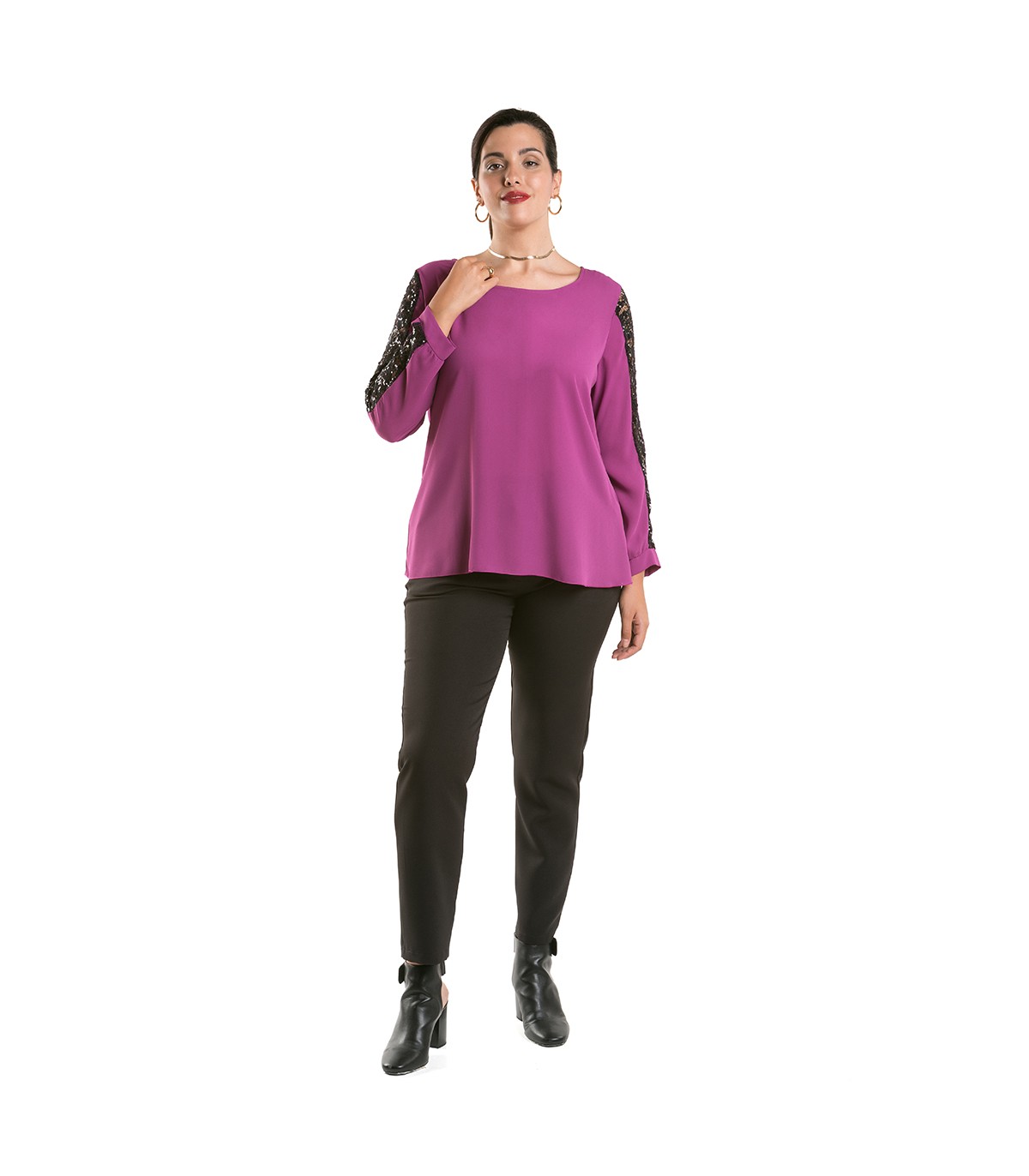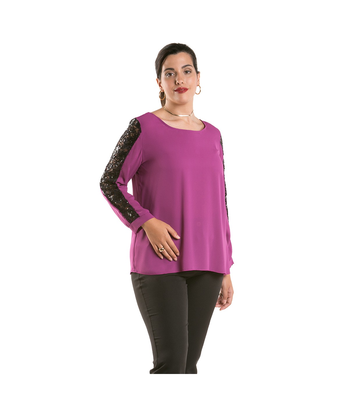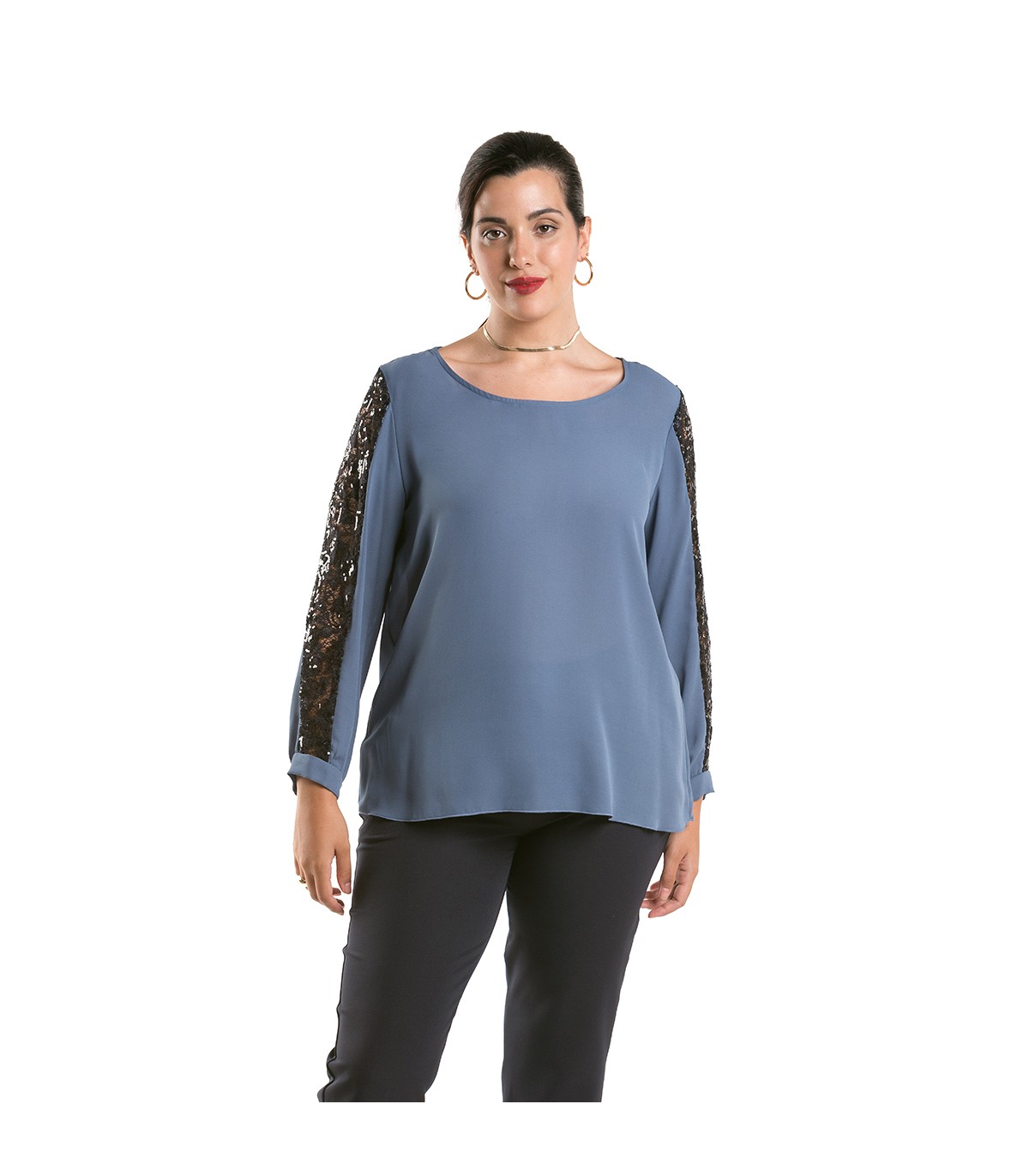 La blusa con manga de lentejuelas de SPG Woman es la opción perfecta para brillar con estilo en tus cenas de empresa, comidas navideñas o eventos especiales.