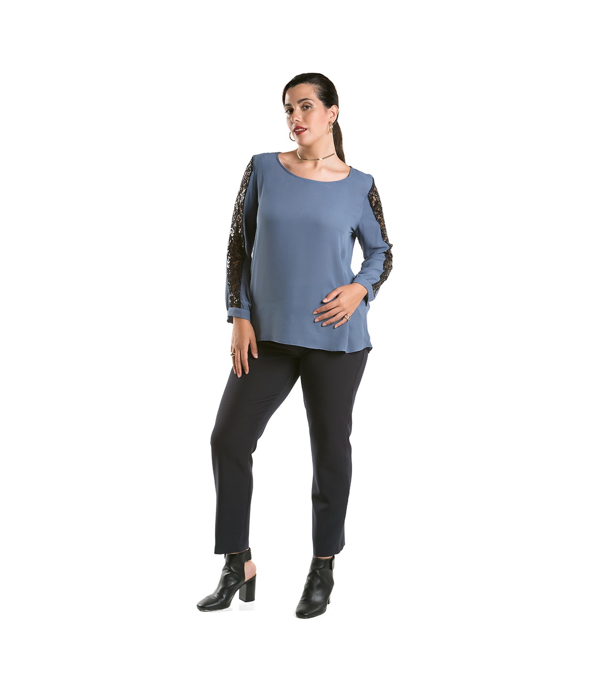 Disponible en dos colores vibrantes —fucsia intenso y azul petróleo—, esta blusa combina a la perfección la comodidad de una prenda versátil con el glamour de la moda curvy más actual.