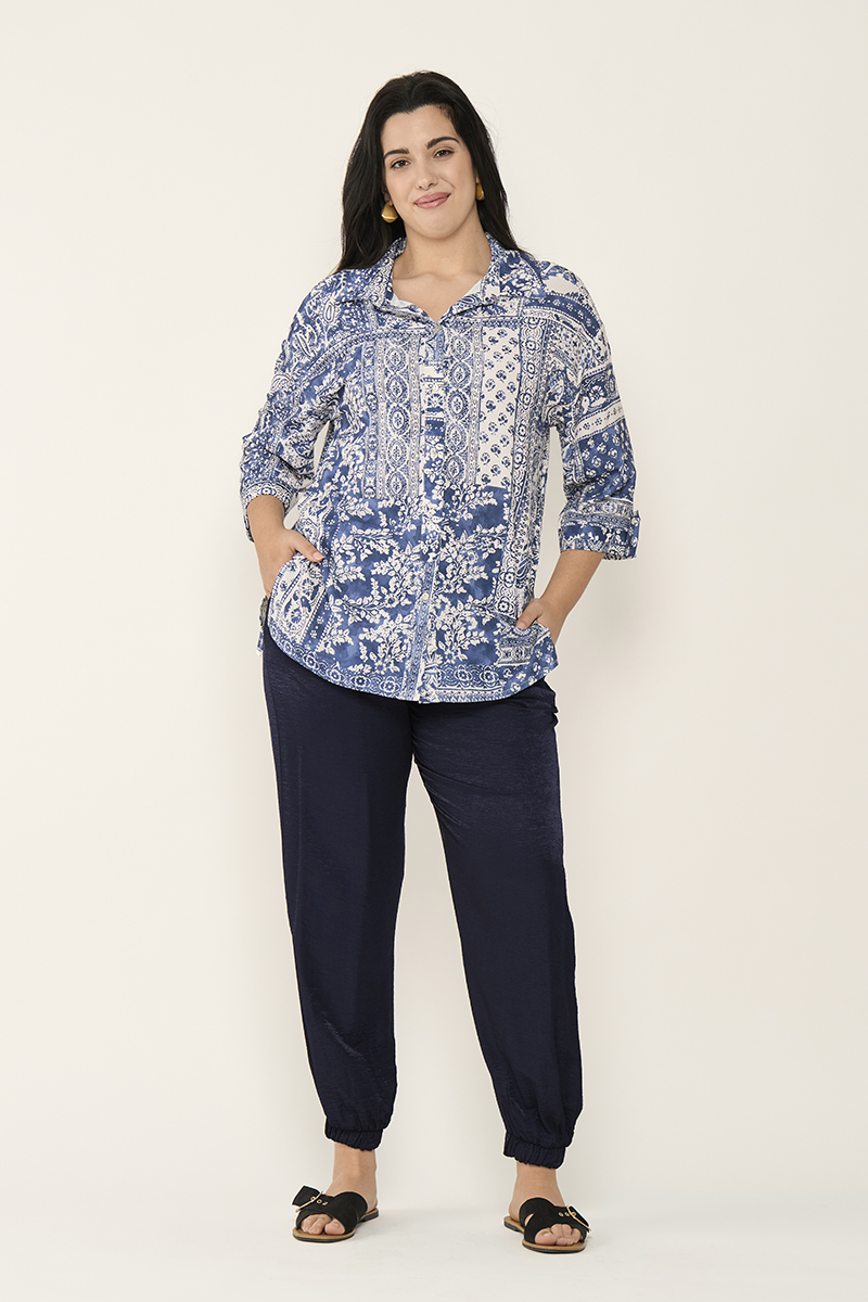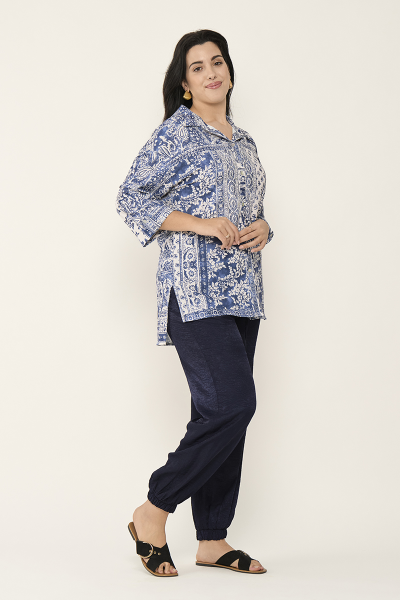 Esta camisa de la marca SPG Woman destaca por su estampado en tonos azul y blanco, inspirado en el estilo patchwork y motivos florales clásicos. Este tipo de estampado vertical y combinado ayuda a estilizar visualmente la figura y aporta luz al rostro.