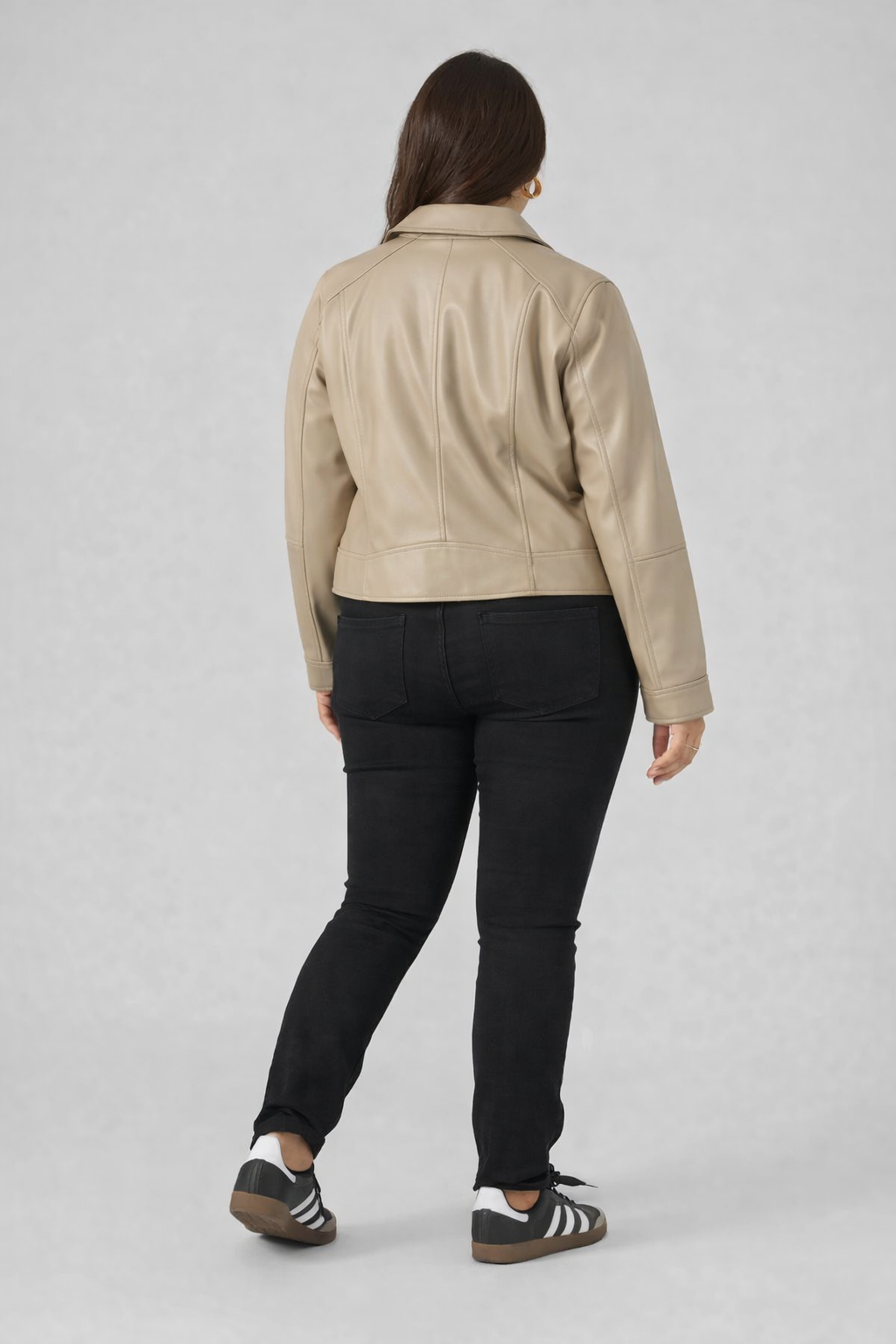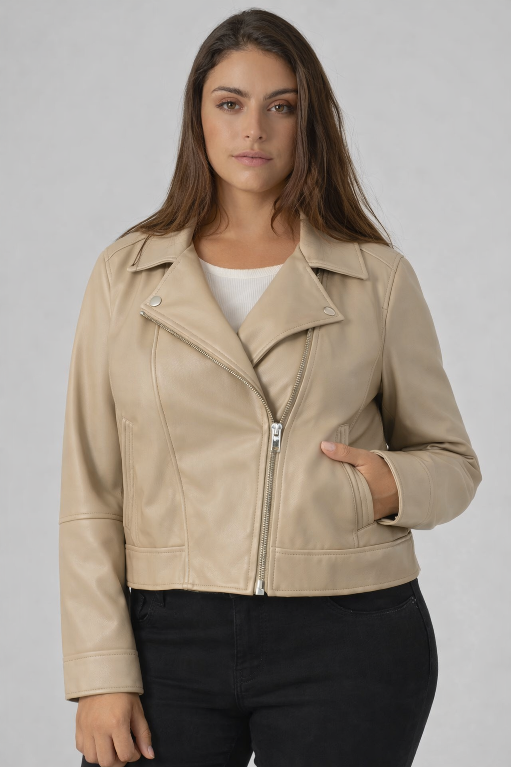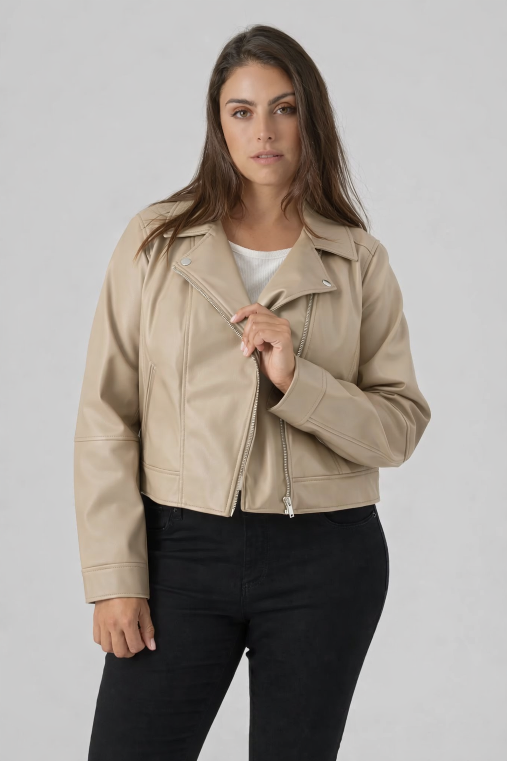 Su diseño tipo biker con cremallera asimétrica estiliza visualmente el torso y aporta estructura al conjunto. El efecto piel (material sintético con acabado similar al cuero) ofrece un look sofisticado y moderno, pero ligero y cómodo para el día a día.