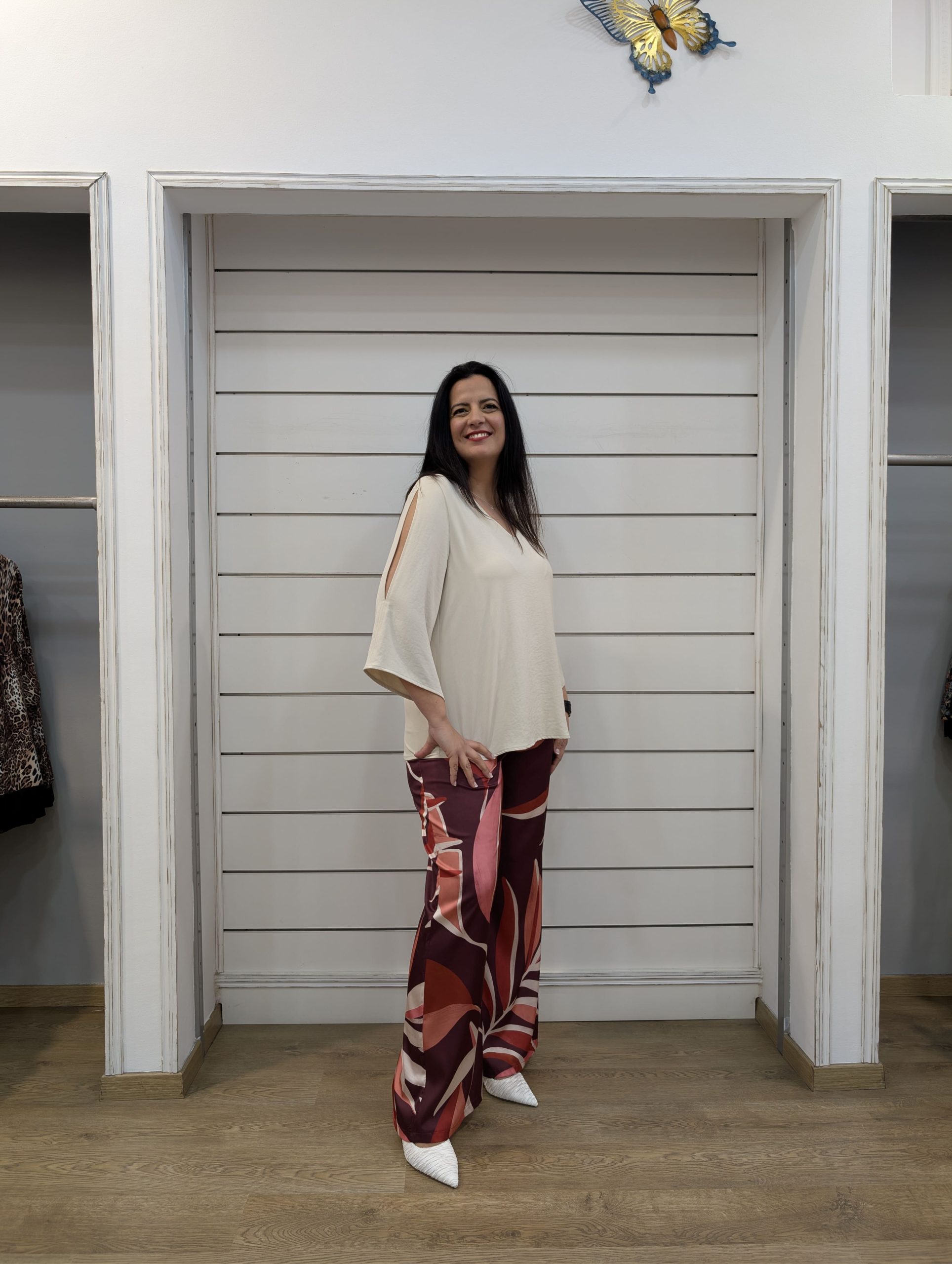 Combinar este pantalón con blusas fluidas en tonos neutros, como la blusa beige que aparece en la imagen, creando un conjunto elegante y equilibrado.