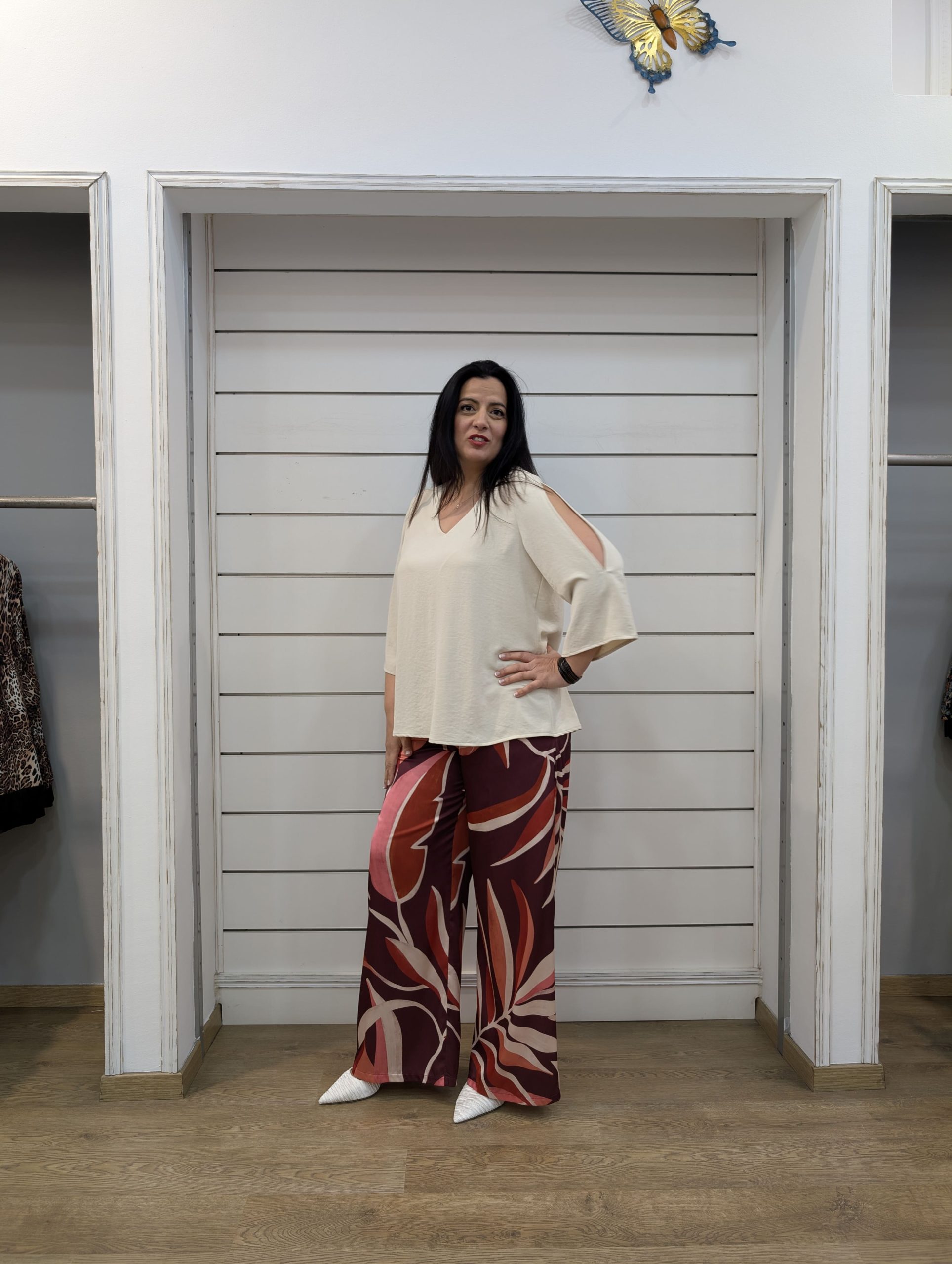 Este pantalón estampado tipo palazzo es una prenda perfecta para mujeres que buscan comodidad sin renunciar al estilo. Su diseño fluido y su estampado en tonos granate, teja y rosa aportan personalidad al look y hacen que sea una pieza muy favorecedora.