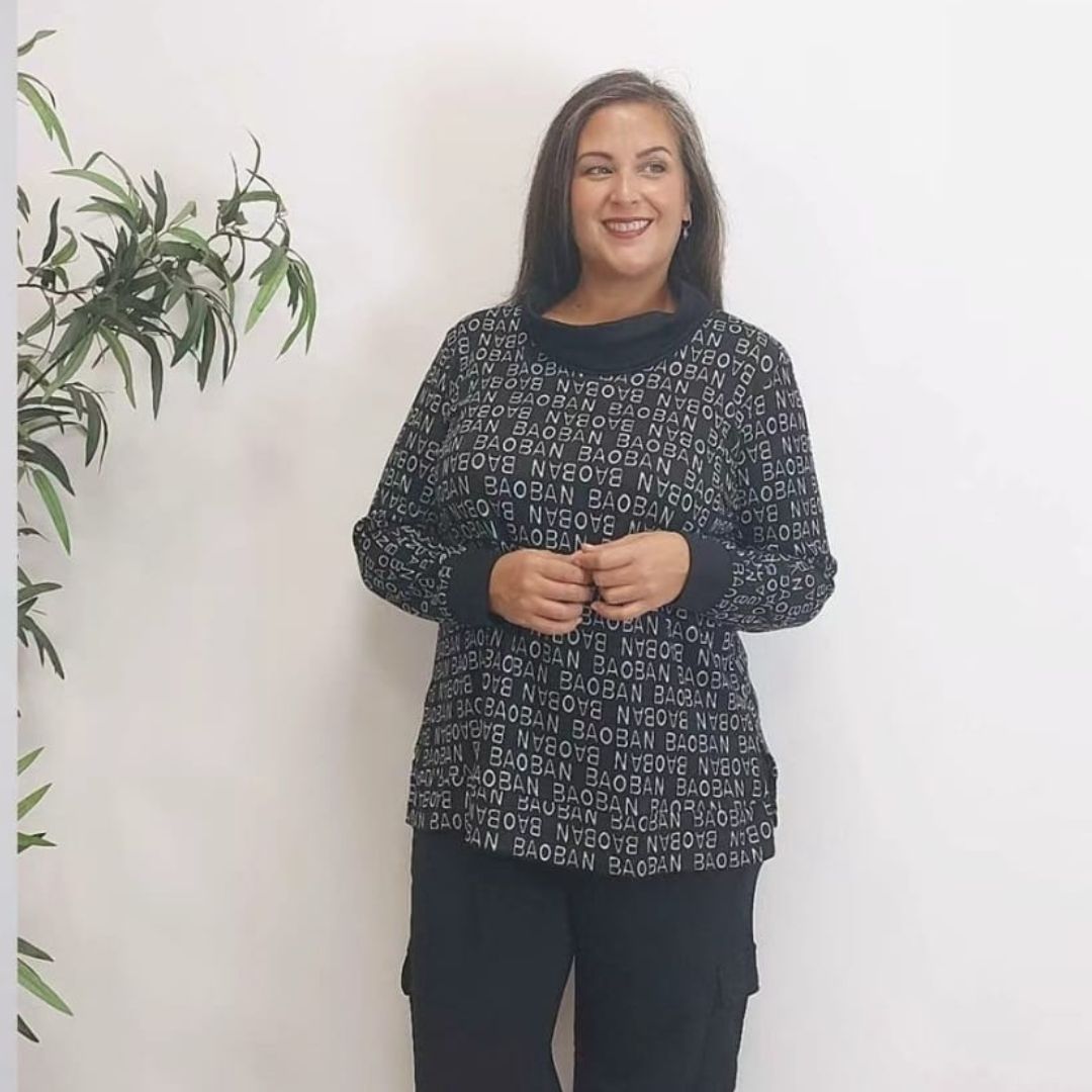 Disponible en dos colores —negro con letras grises o beige con letras negras—, su cuello vuelto y los puños en contraste le dan un toque actual y favorecedor. Combínala con unos vaqueros o pantalones jogger para un look casual con actitud.