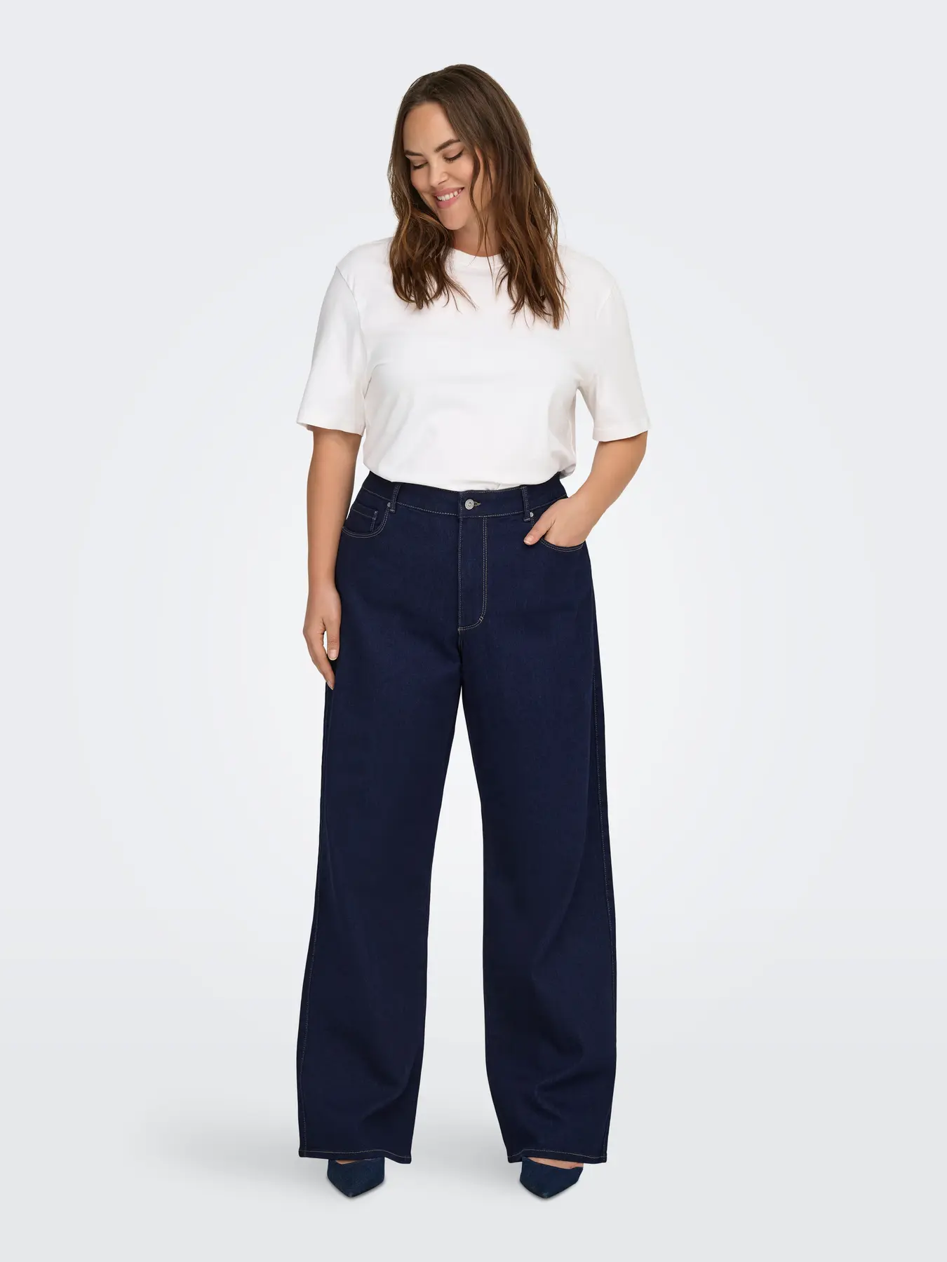 El vaquero ancho azul oscuro para mujer en talla grande es una de las grandes tendencias de la moda actual. Su diseño amplio y cómodo crea una silueta elegante que estiliza visualmente el cuerpo sin marcar.